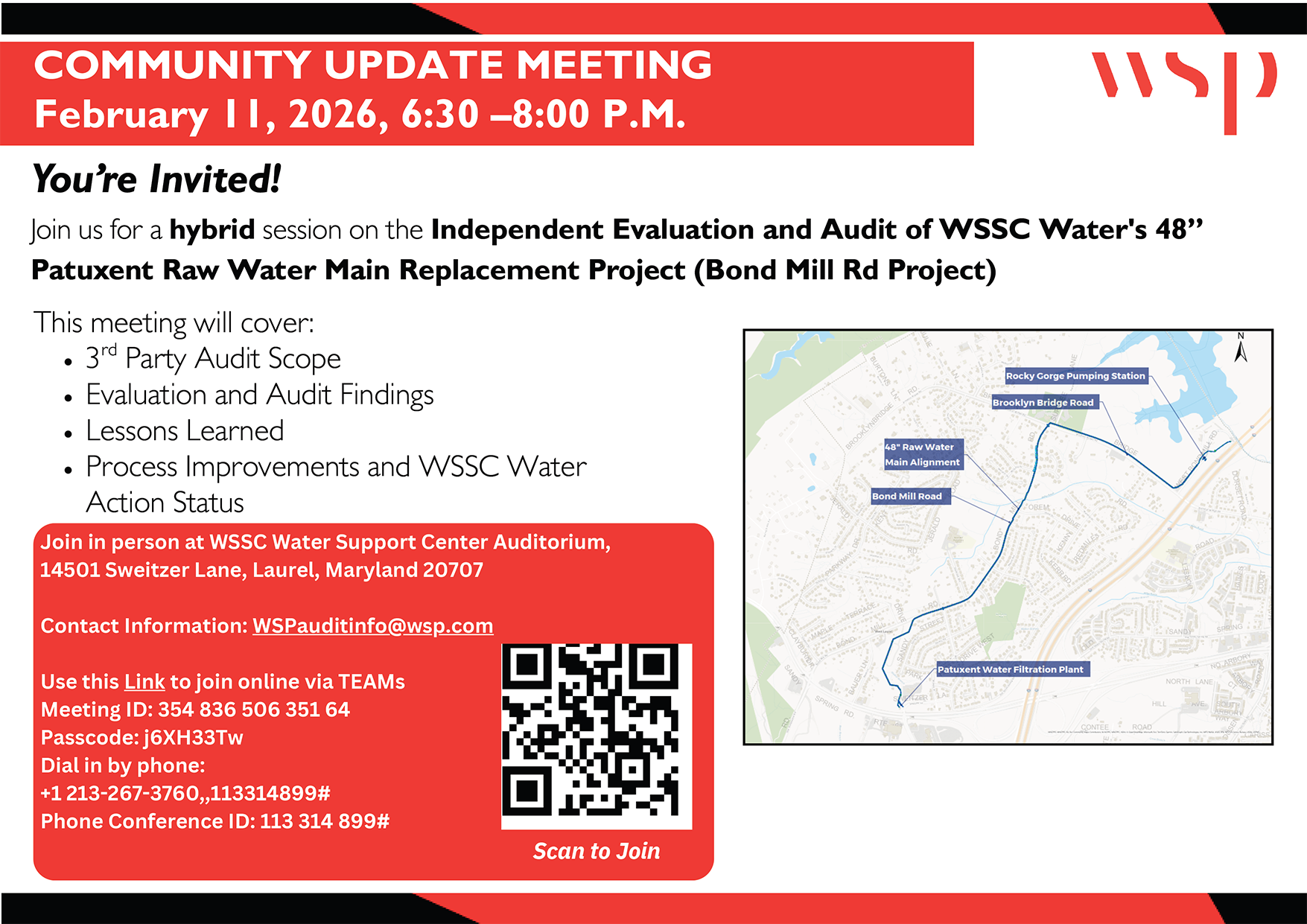 Join us at 6:30 p.m. on Wednesday, February 11, 2026, either in person or via Microsoft Teams, for a community update on the Independent Evaluation and Audit of WSSC Water's 48" Patuxent Raw Water Main Replacement Project (Bond Mill Road Project).